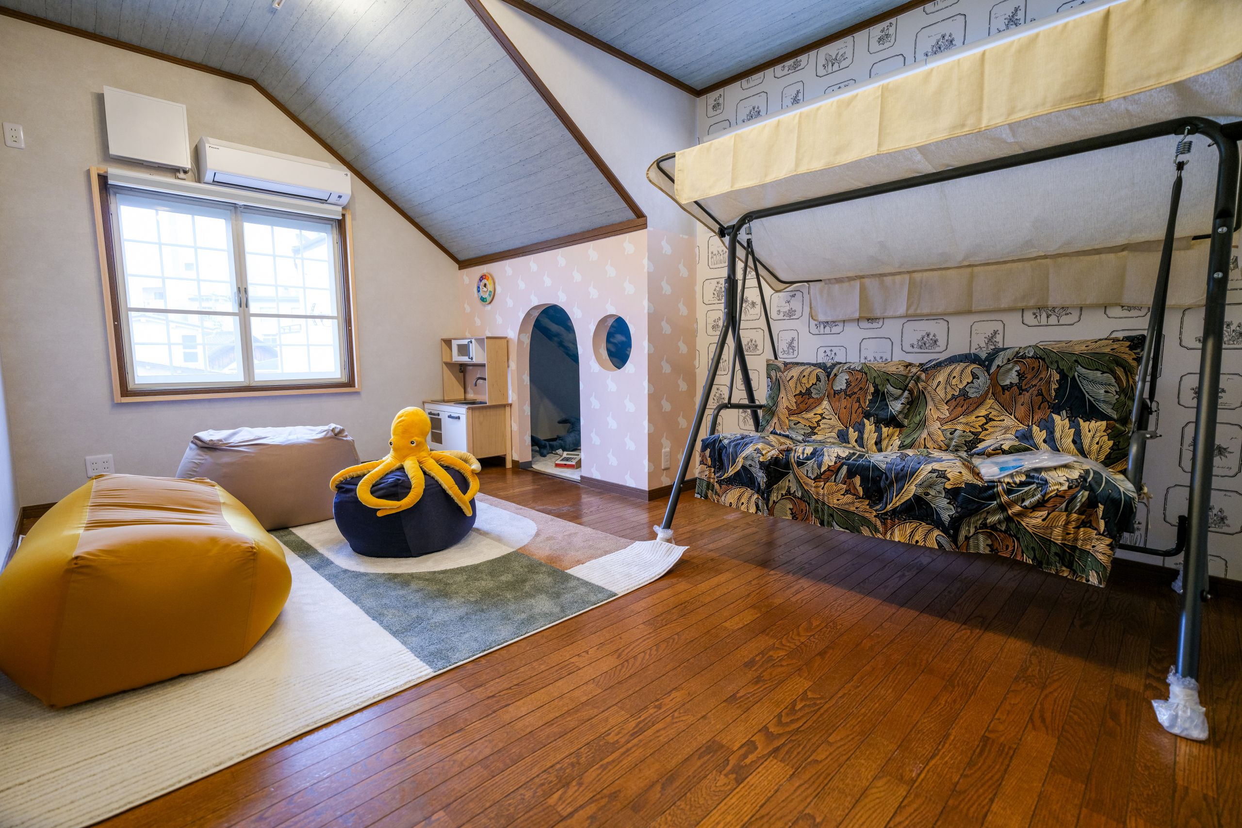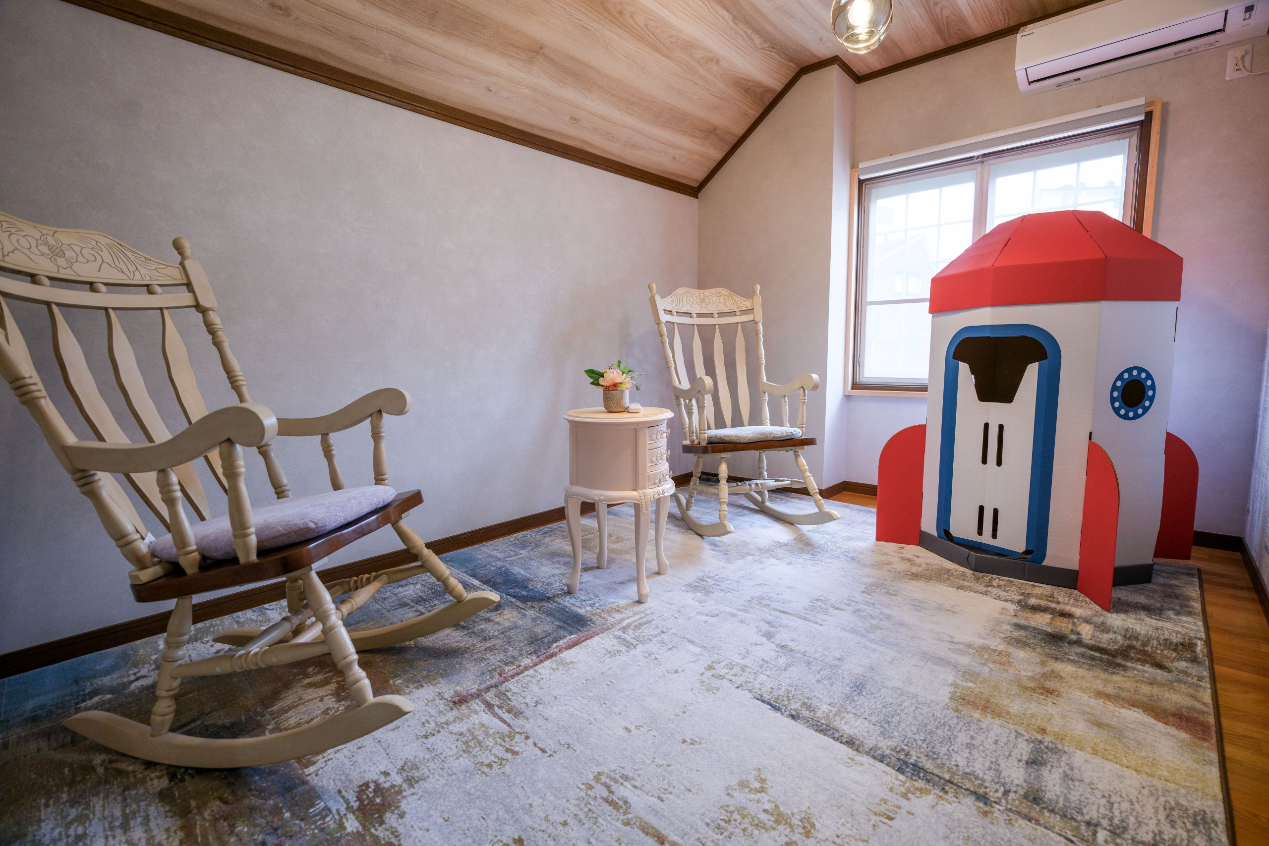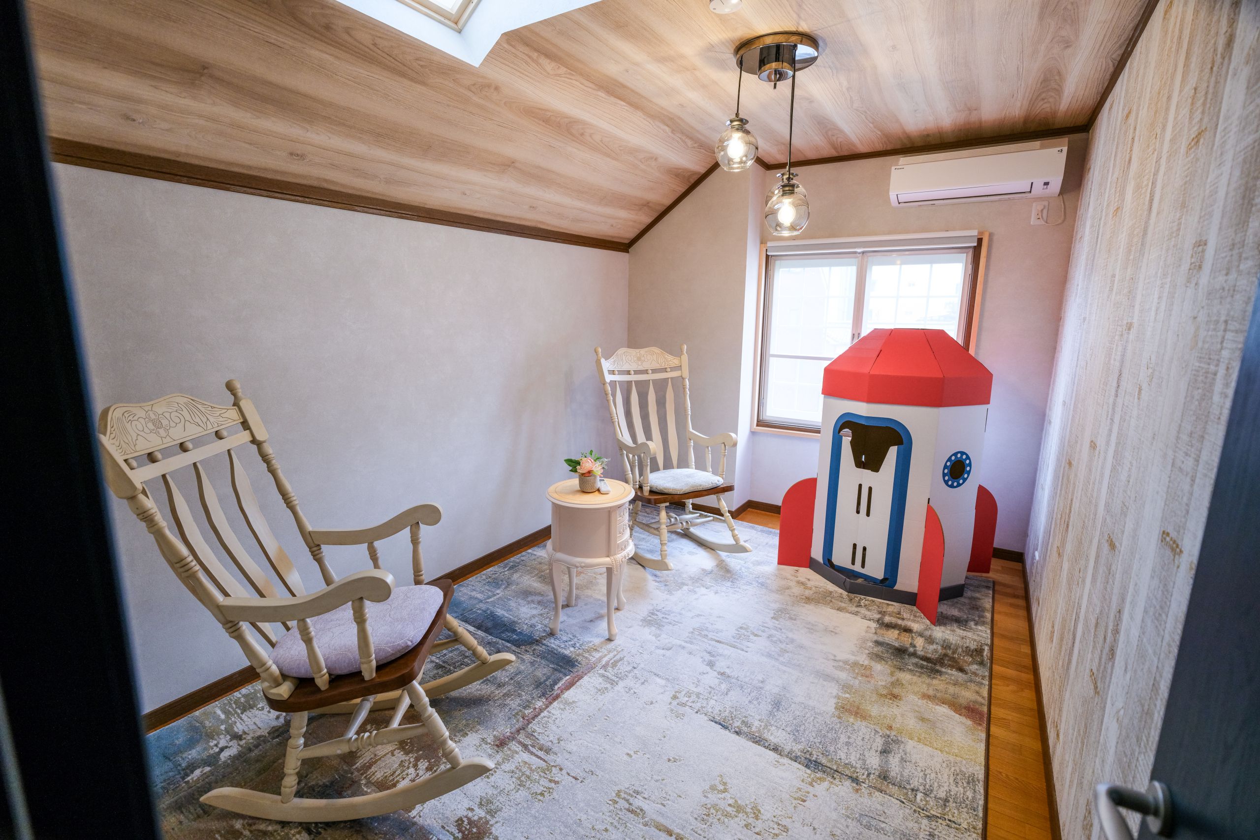 1部屋はロッキングチェアやテーブルを備えたリラックスルーム、もう1部屋はブランコチェア、ビーズクッション、子ども用ハウスなどを備えたキッズスペースとなっており、ご家族連れのお客様に大変好評です。