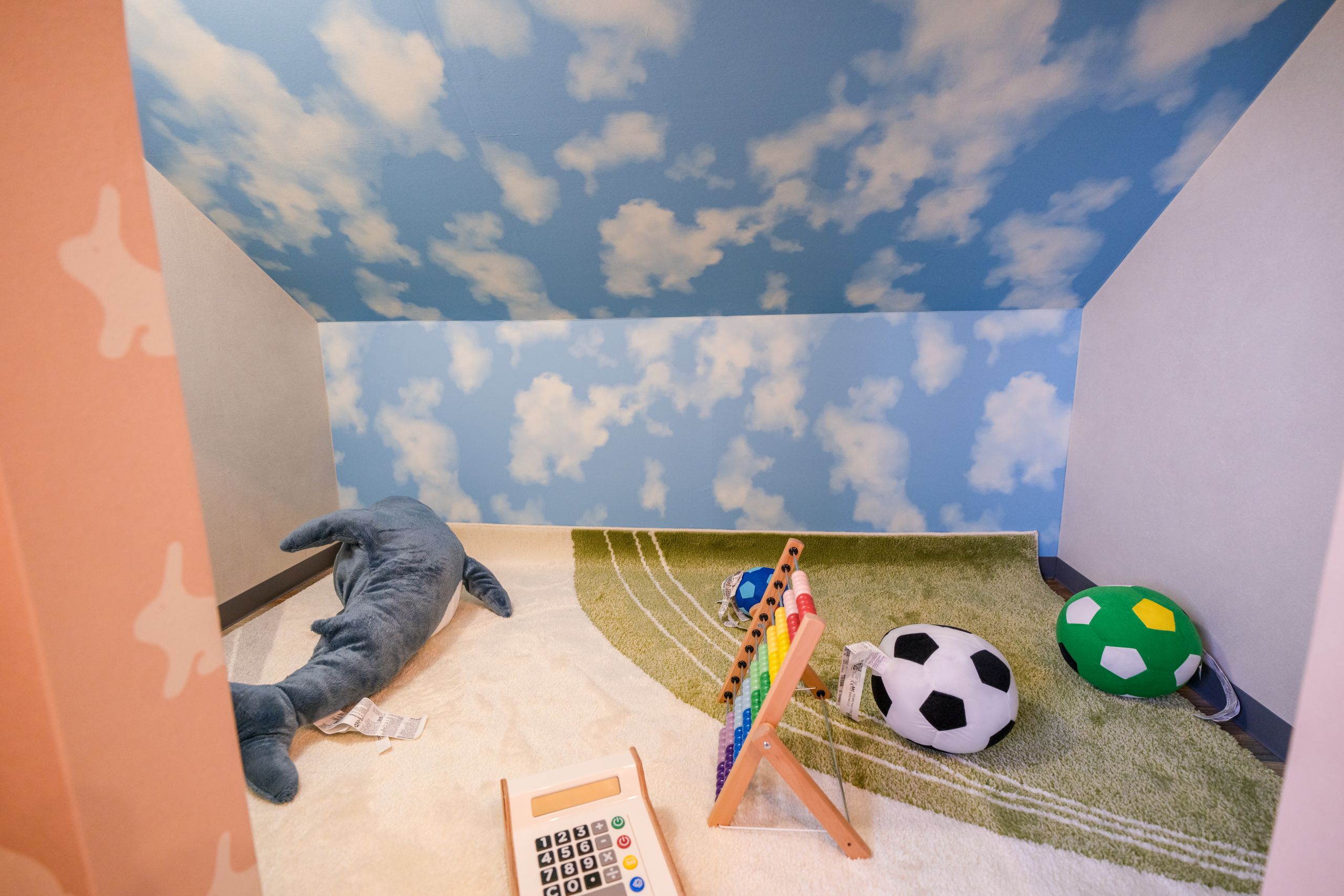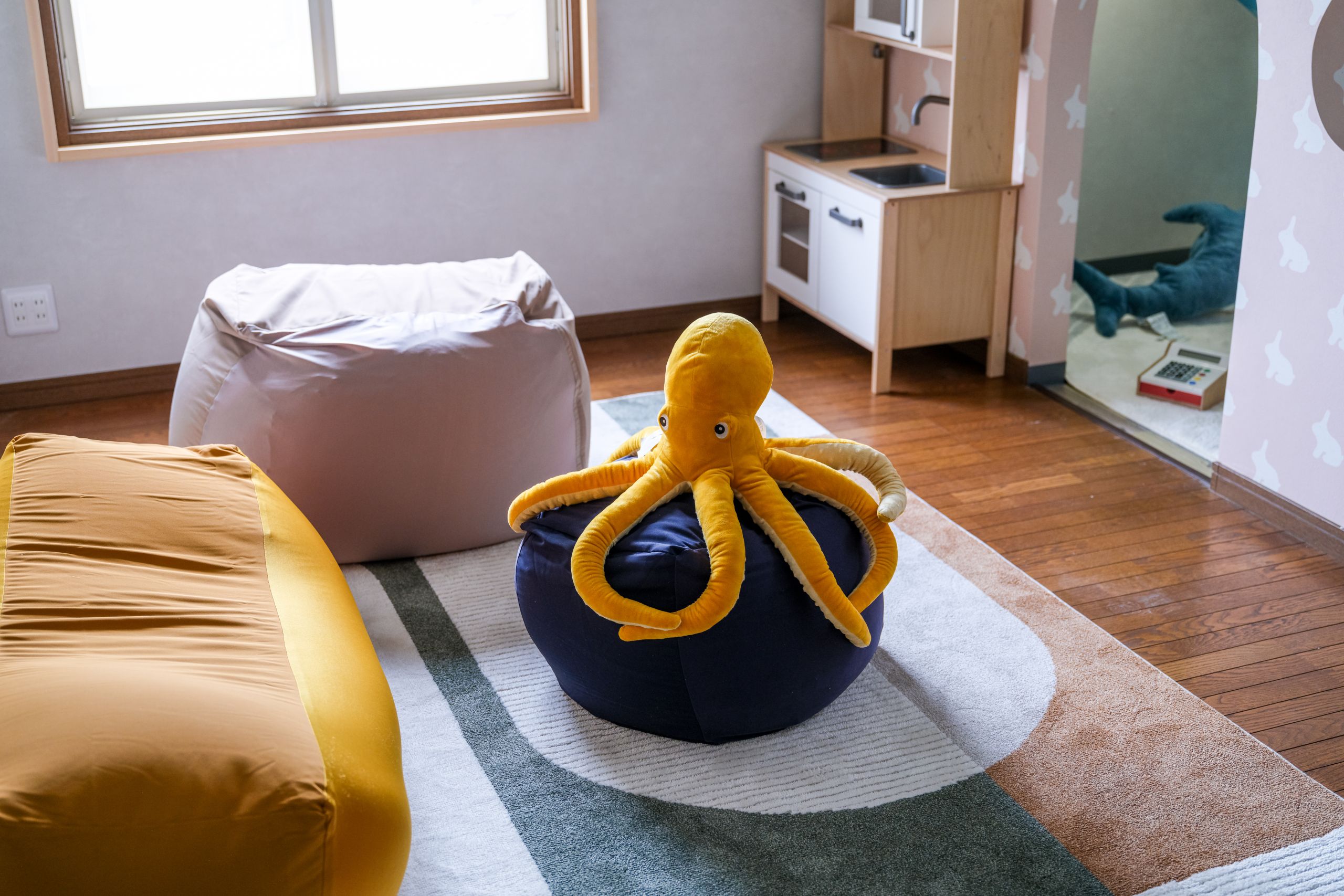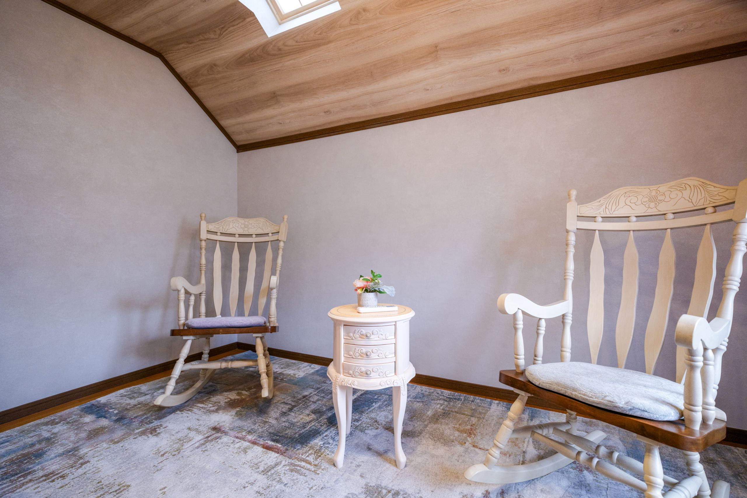 1部屋はロッキングチェアやテーブルを備えたリラックスルーム、もう1部屋はブランコチェア、ビーズクッション、子ども用ハウスなどを備えたキッズスペースとなっており、ご家族連れのお客様に大変好評です。