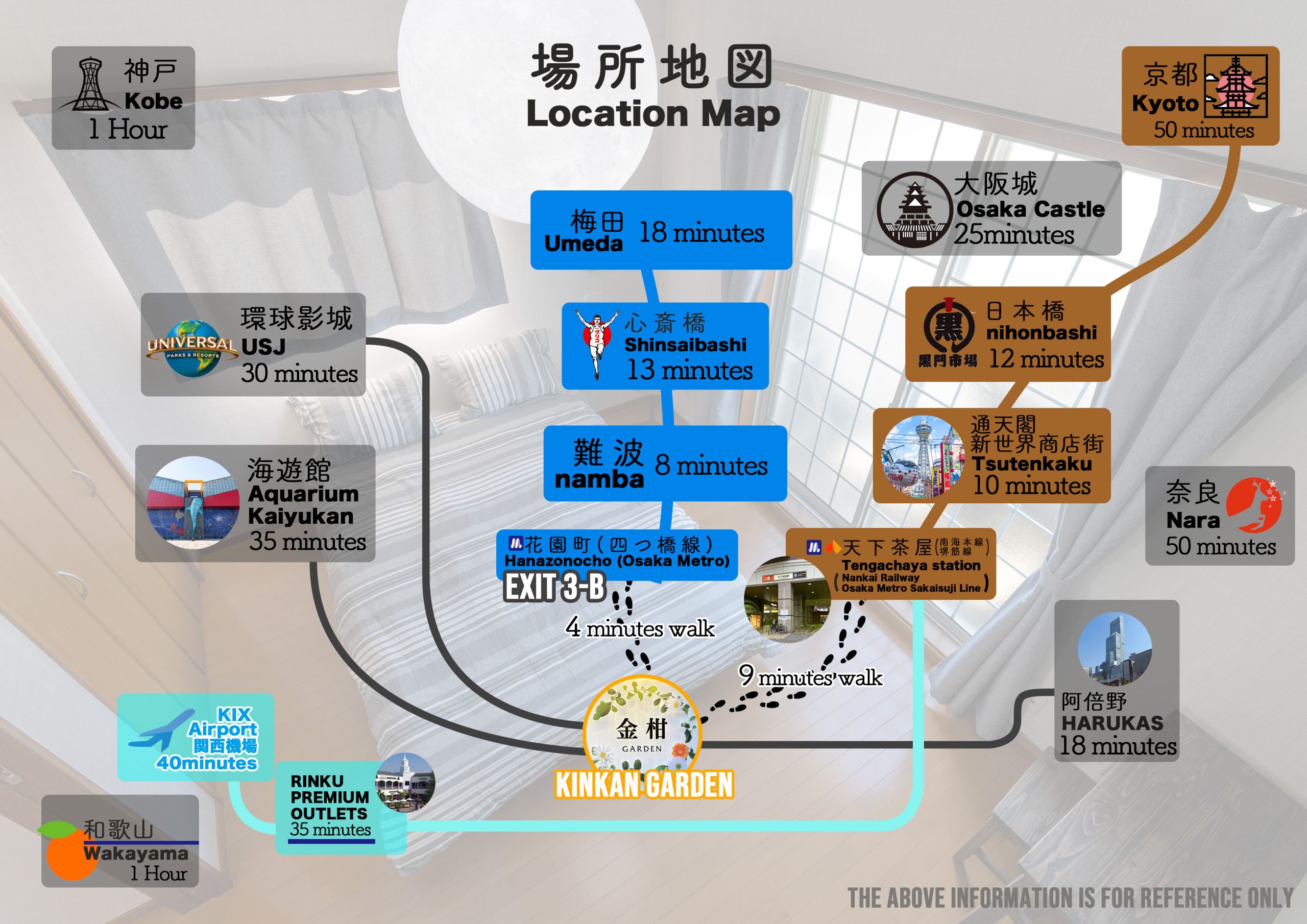 Kinkan Gardenのそばには鶴見橋商店街、通天閣、Tsumori Shrineなどの人気観光スポットがあります。大阪国際空港まで24kmです。